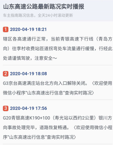 点击路况入口,即可获取山东高速路况实时播报